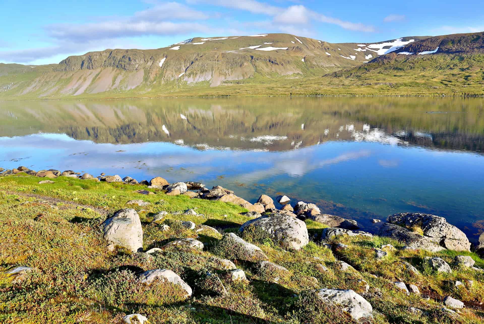 La descente vers Veiðileysufjörður traverse des pentes qui peuvent rester enneigées, même si vous venez en Islande en été. Il est donc conseillé de faire preuve de prudence et de porter des chaussures adaptées 🥾 Vous longerez ensuite le fjord jusqu’au point de débarquement des bateaux.